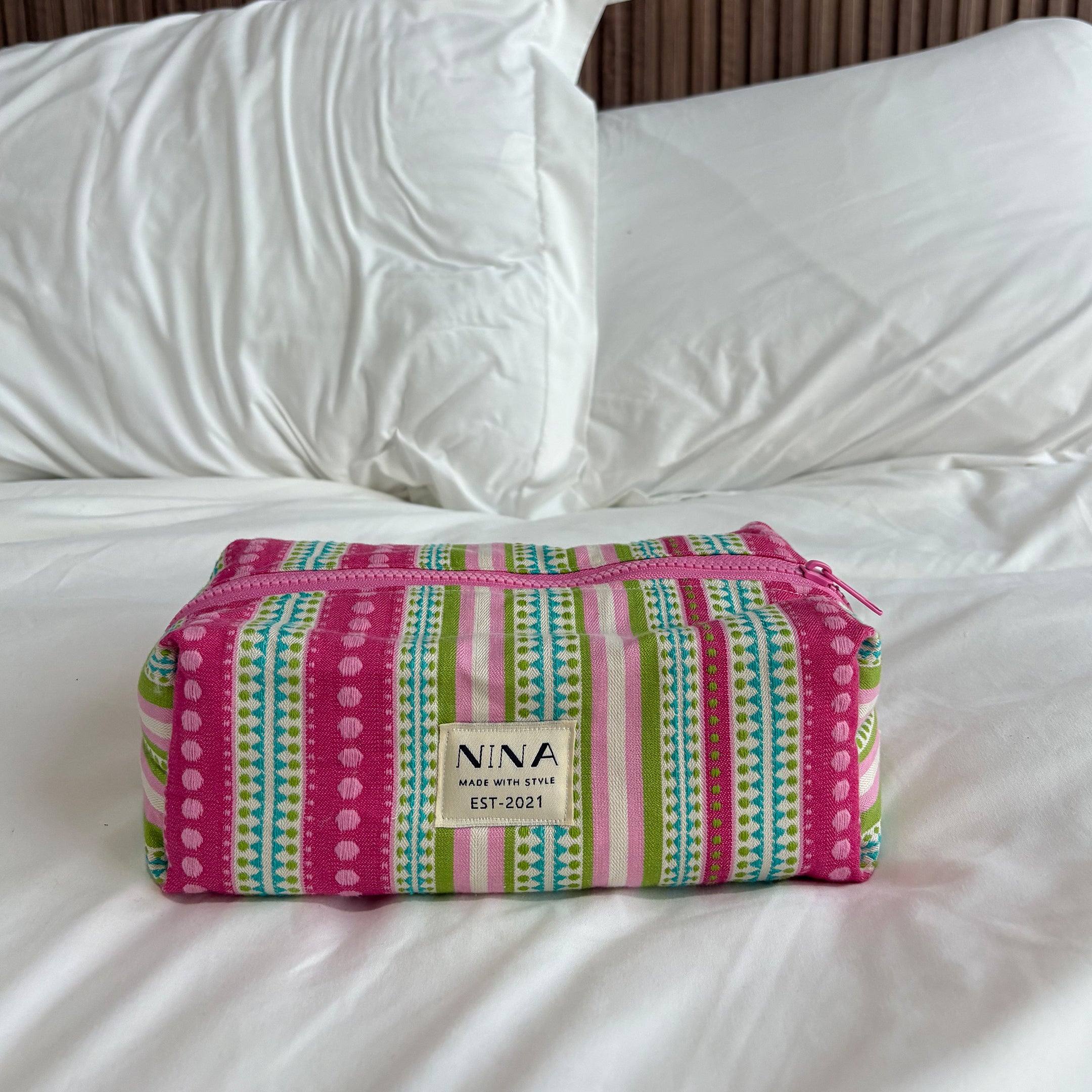 La Cosmetiquera Large Nina está diseñada para quienes necesitan más espacio sin renunciar al estilo. Su tamaño amplio te permite llevar una mayor cantidad de productos y organizar con facilidad desde tu maquillaje favorito hasta artículos de uso diario.Es perfecta para guardar más cosméticos, varios lapiceros o útiles de la universidad, ropa ligera para tus viajes, o esos objetos personales que no pueden faltar en tu rutina.Un accesorio práctico, versátil y elegante que no solo te acompaña, sino que también hace más linda y ordenada tu rutina.