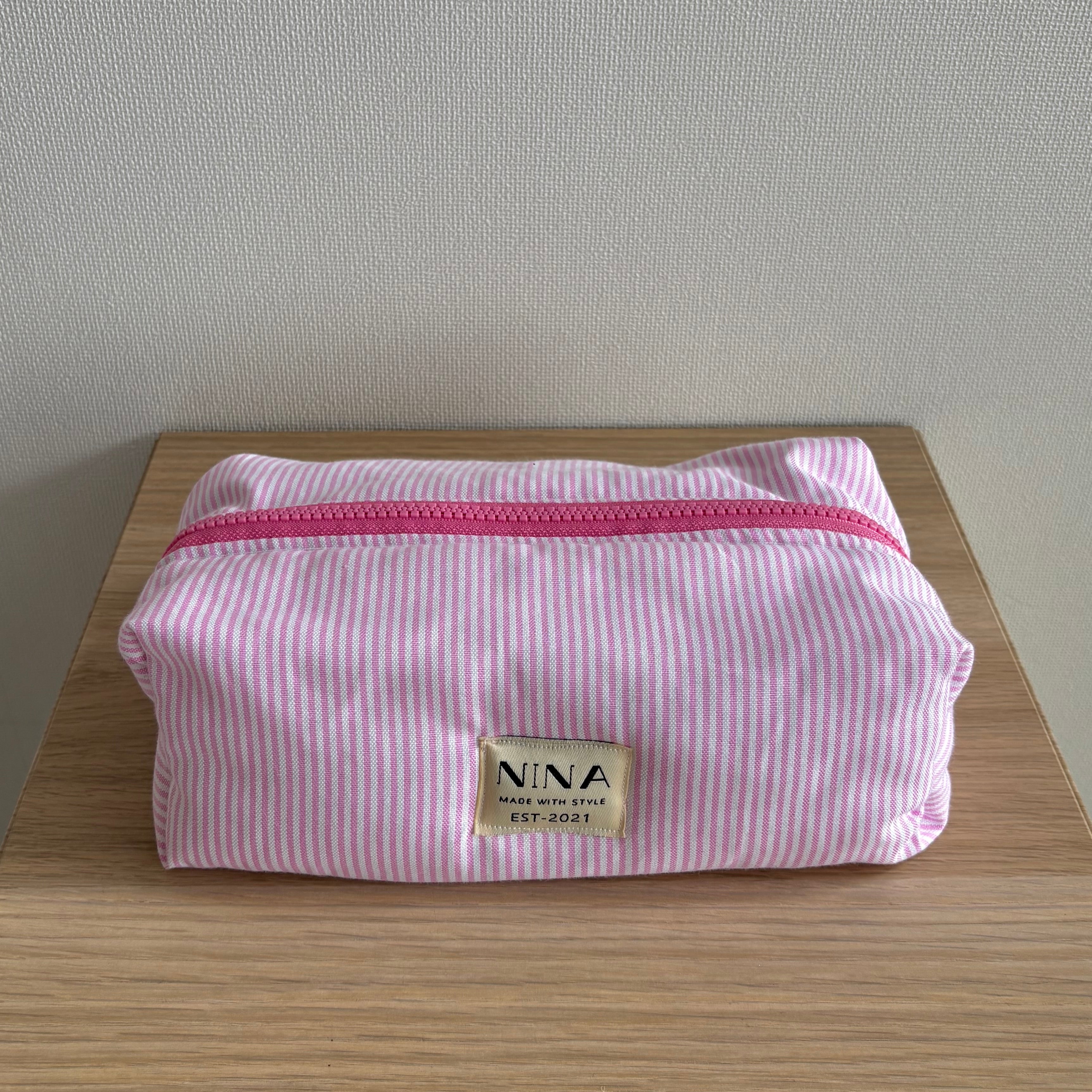 Diseñada para acompañarte todos los días con estilo y funcionalidad, nuestra cosmetiquera large en rayas rosadas es ese básico que no puede faltar en tu rutina. Su tamaño amplio te permite llevar desde tu skincare hasta tus esenciales de maquillaje, mientras que su diseño en tela de rayas y cierre rosado le da un toque chic y alegre. Confeccionada con materiales resistentes y un interior espacioso que se adapta a tu día a día, esta pieza no solo es práctica, también refleja el sello de Nina: detalles cuidados y diseño con personalidad.   TAMAÑO LARGE: Ideal para llevar todos tus esenciales, desde maquillaje y skincare hasta accesorios. ESTILO PUFF: Su textura alcochada y ligera le da un look moderno y único.     Material Tela de algodón estampado de rayas. Medidas 29 cm de largo, 15 cm de ancho y 7 cm de alto